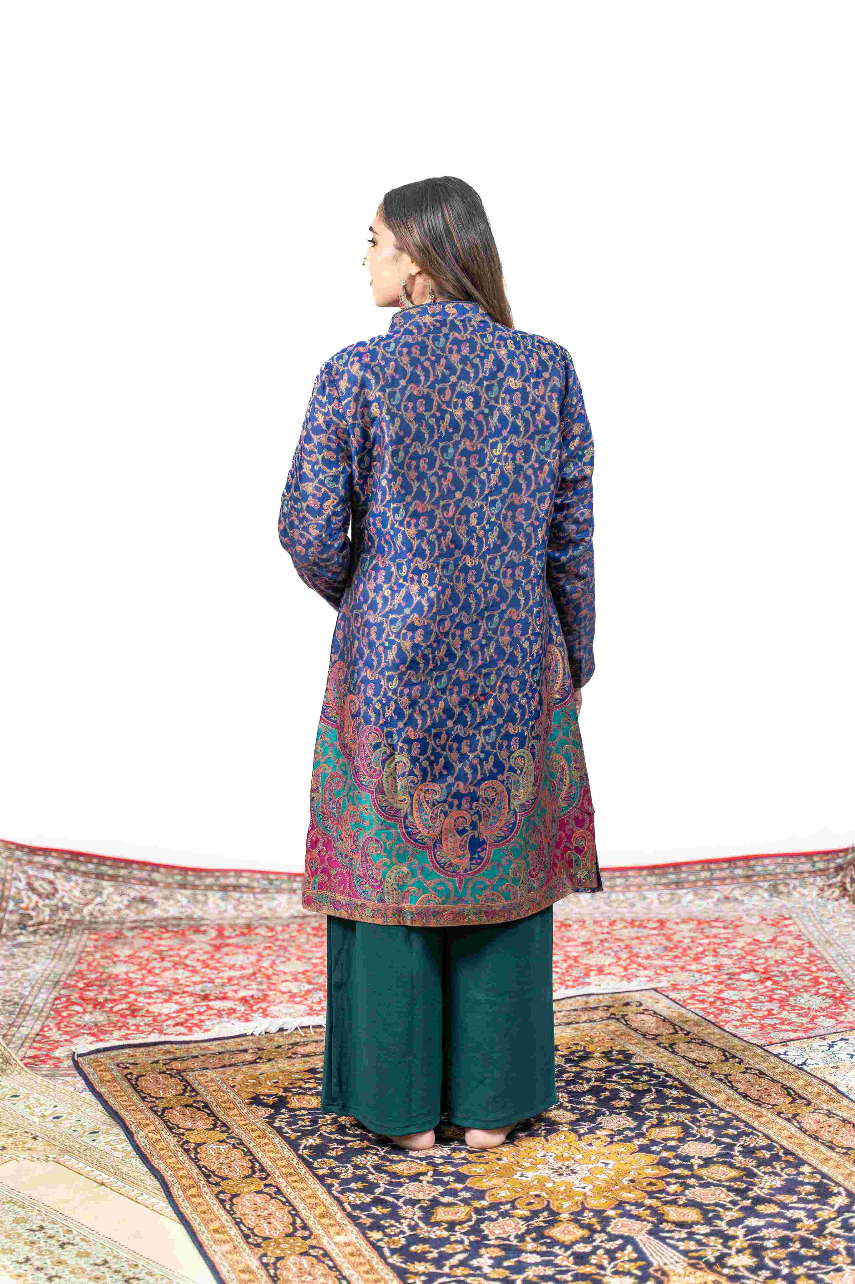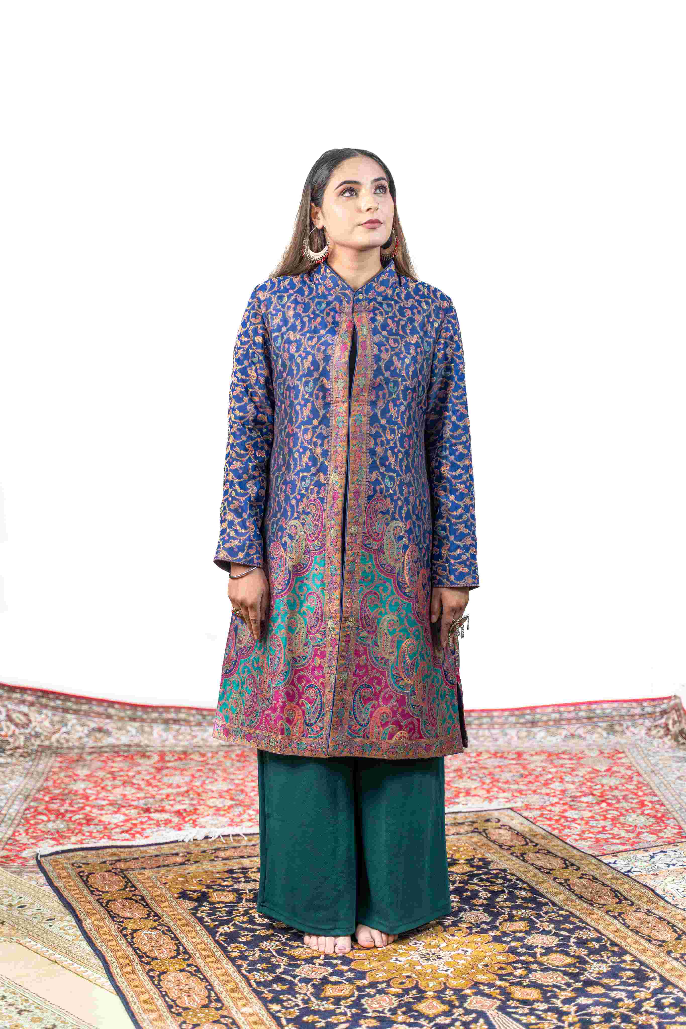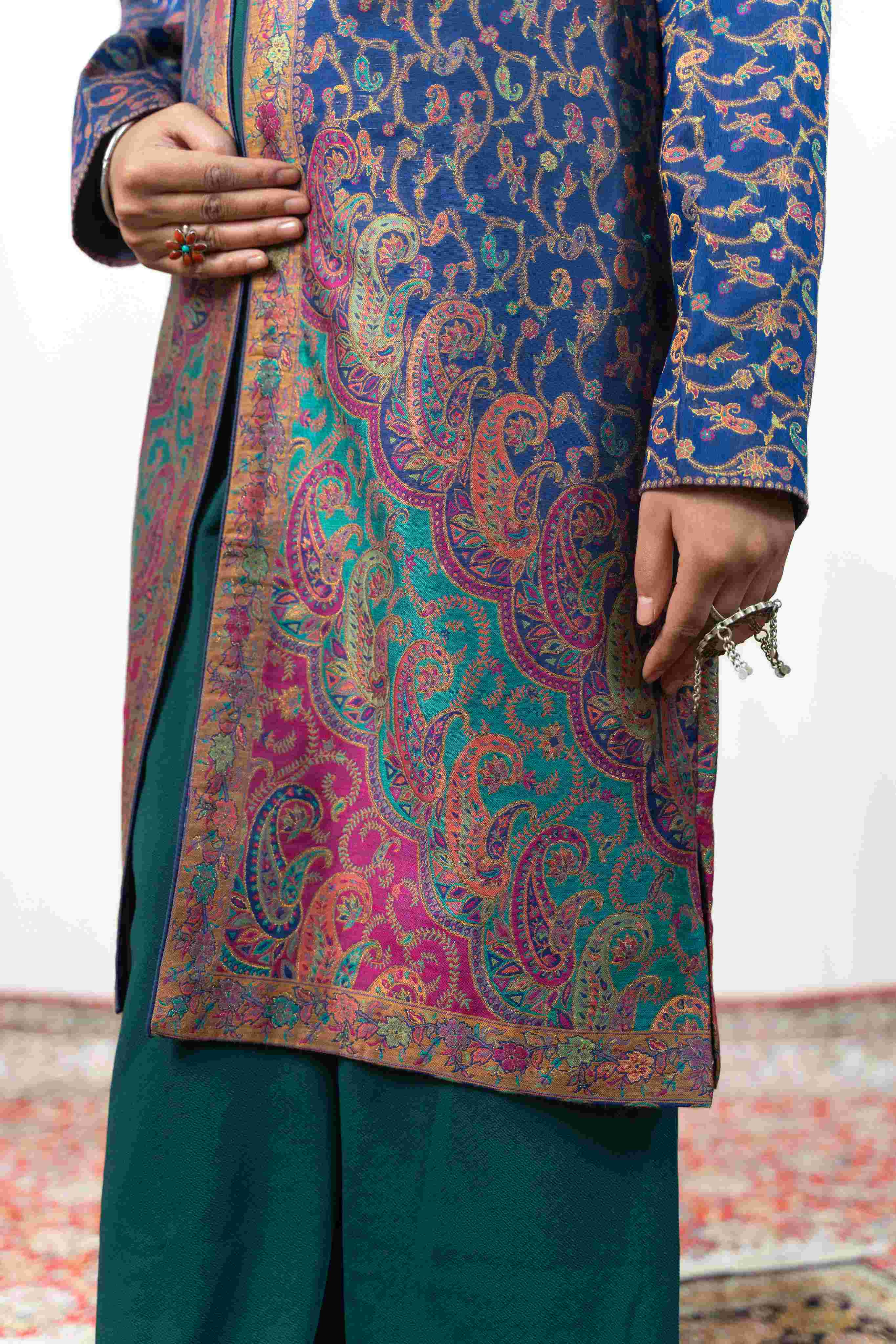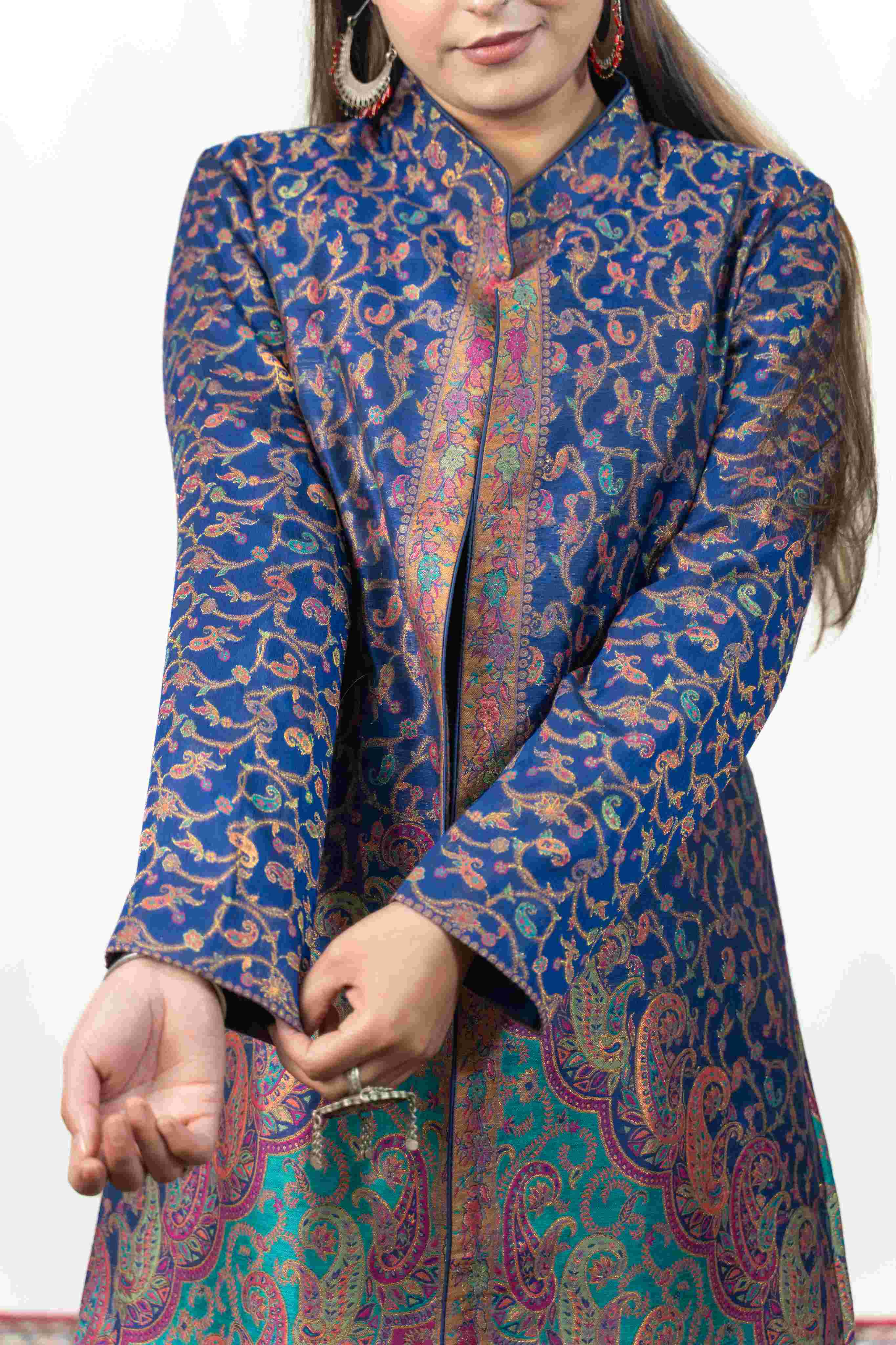 Kashmiri Kani With Zari Embroidery Jacket - Blue Zari | Silk Long