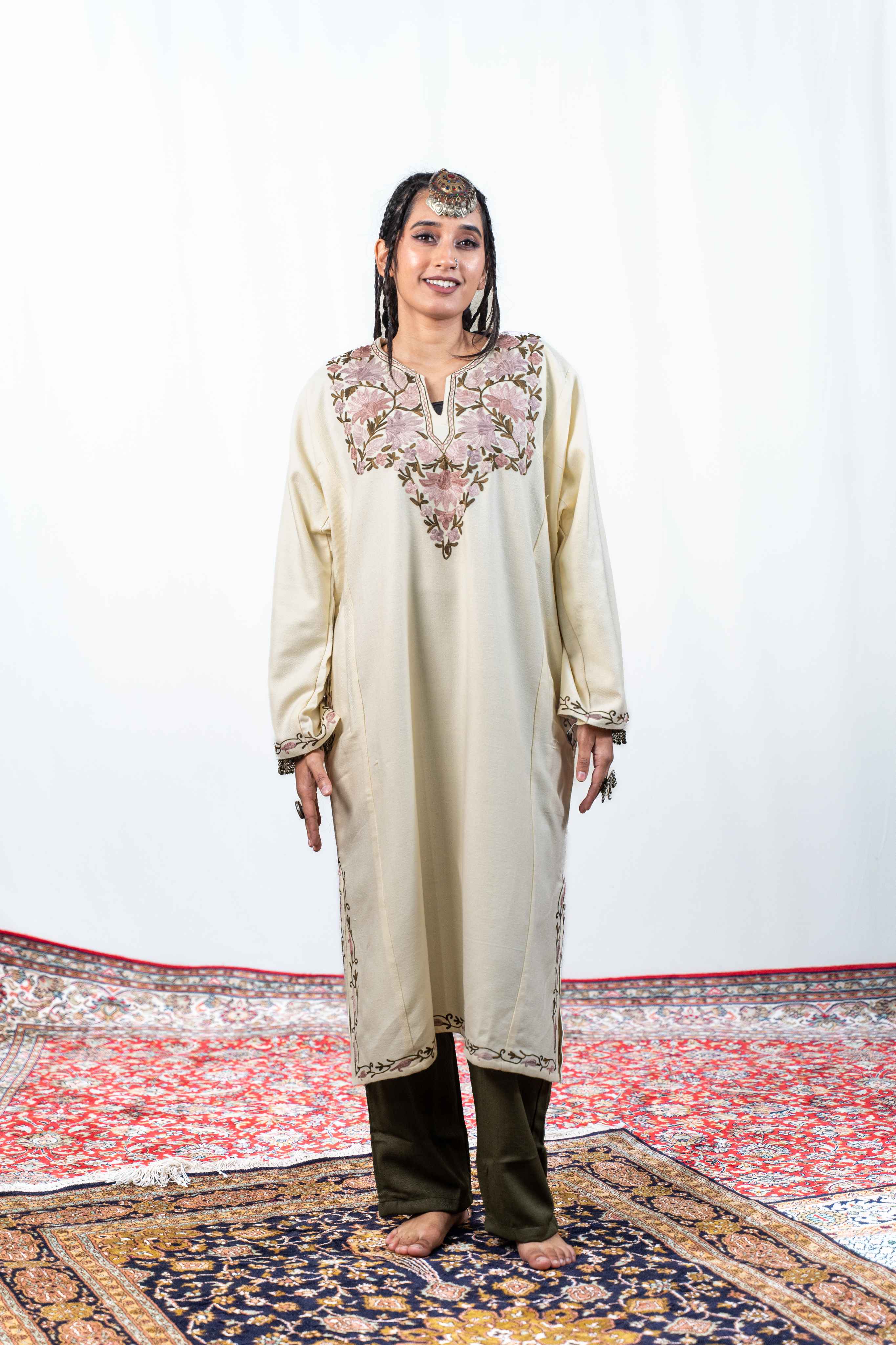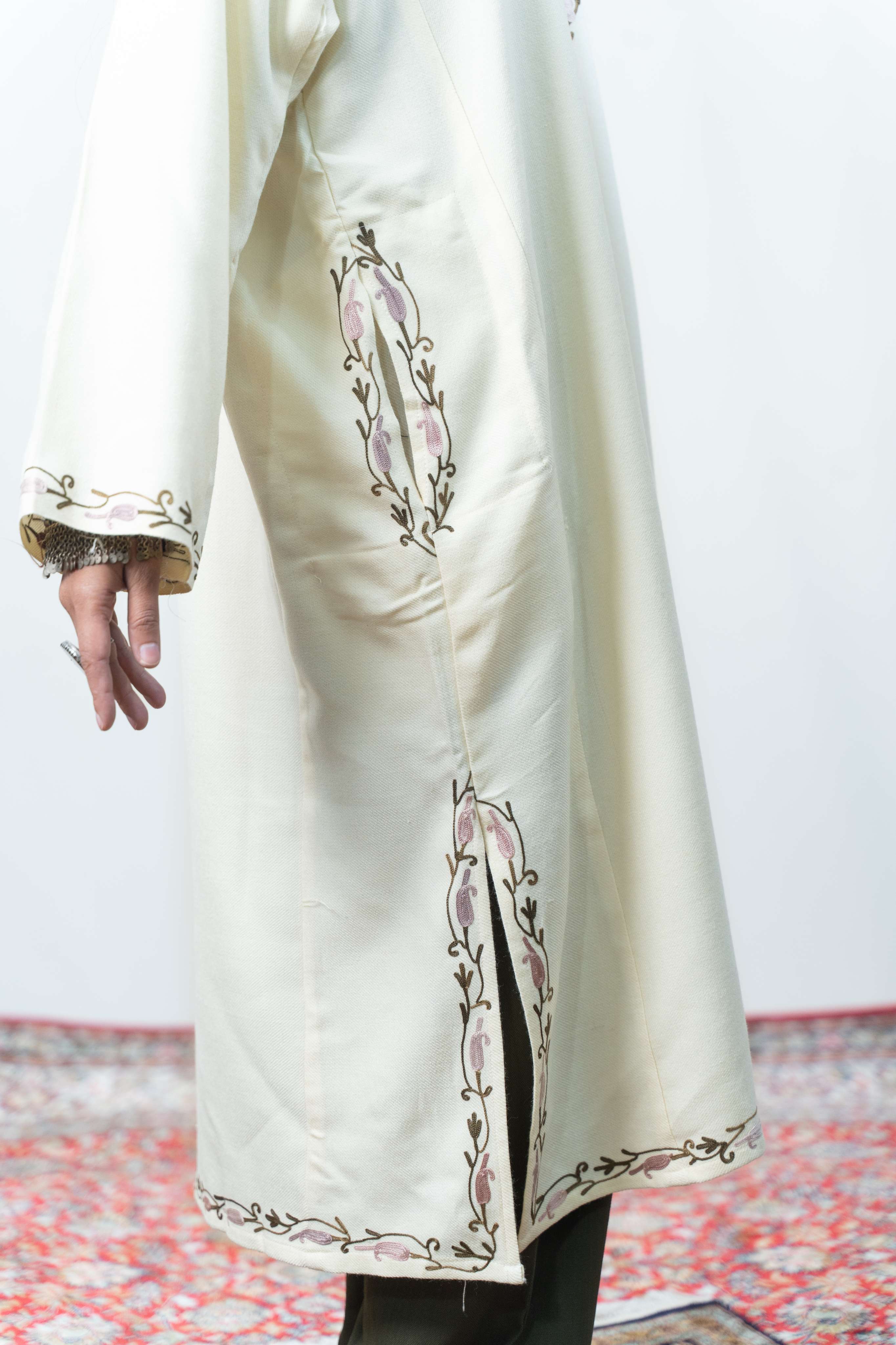 This Pearl White Aari Work Pheran is for those who dare to make an impact. Adorned with stunning aari embroidery across the neckline, back border, sleeves, and pockets, it's a fearless celebration of Kashmiri craftsmanship. Despite its lightweight construction, this pheran wraps you in unexpected warmth—perfect for the bold spirit who refuses to sacrifice comfort for style. Practical pockets ensure you're always ready for anything. A daring choice that commands attention while honoring centuries of artisanal tradition.