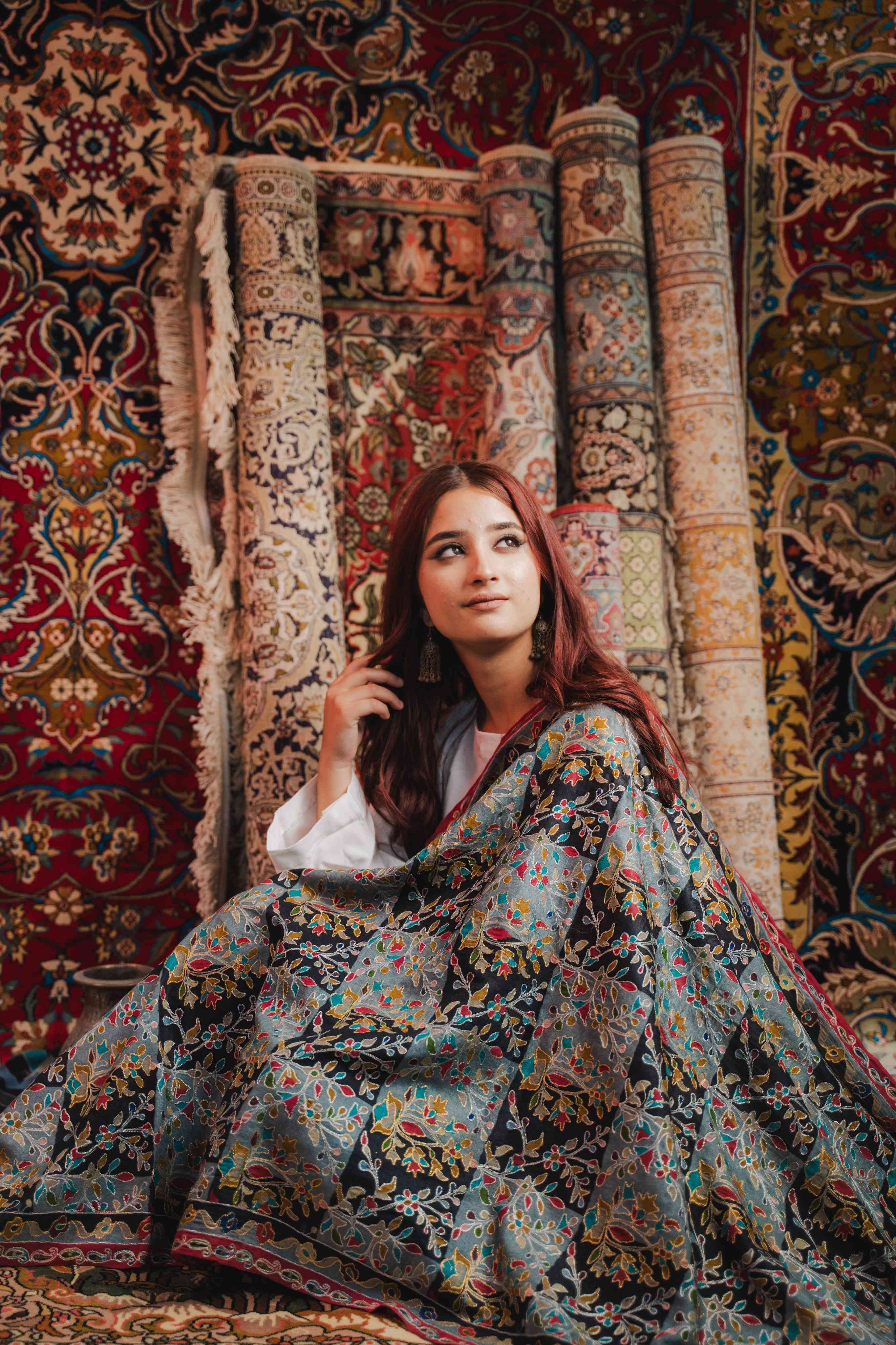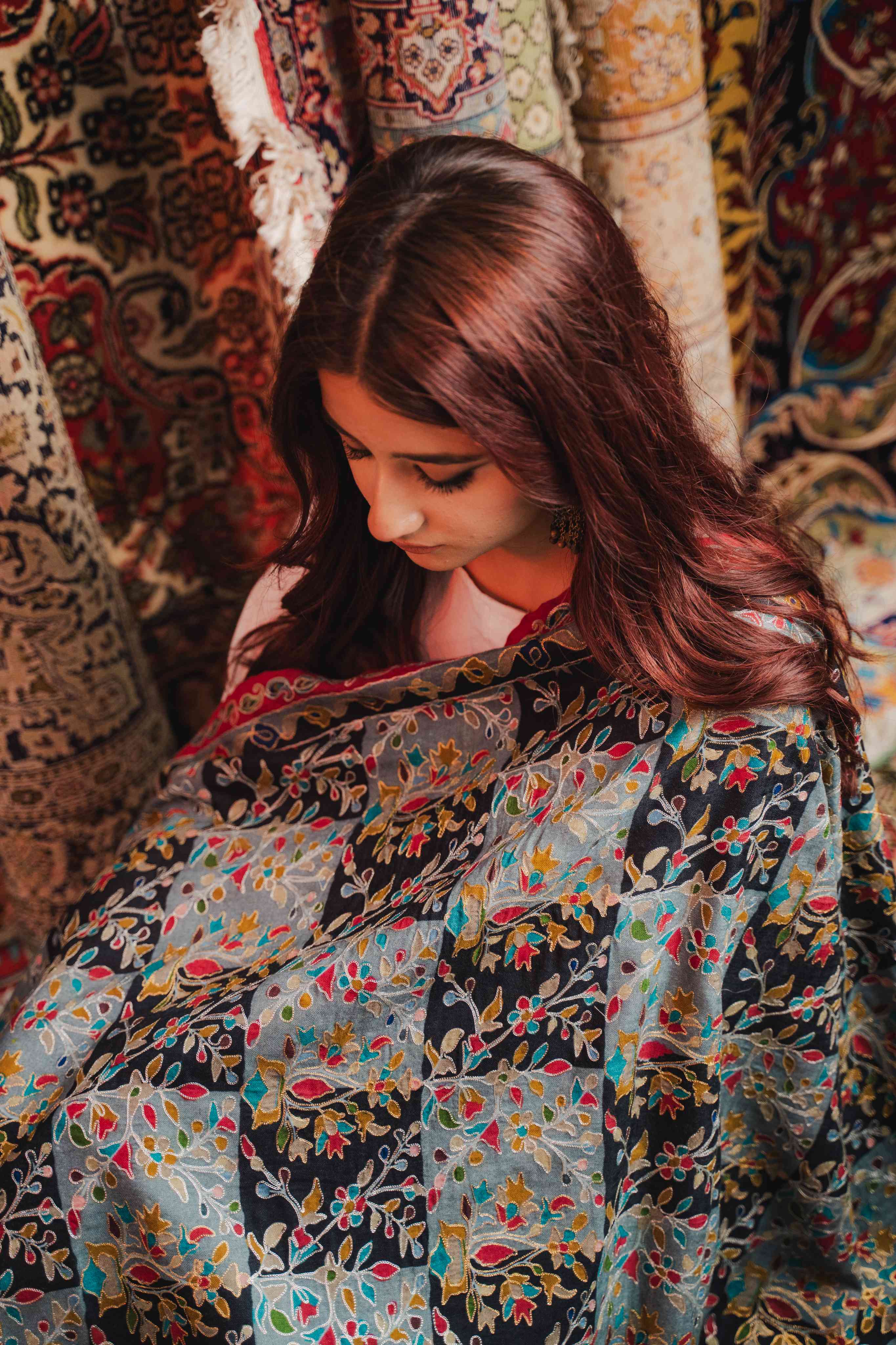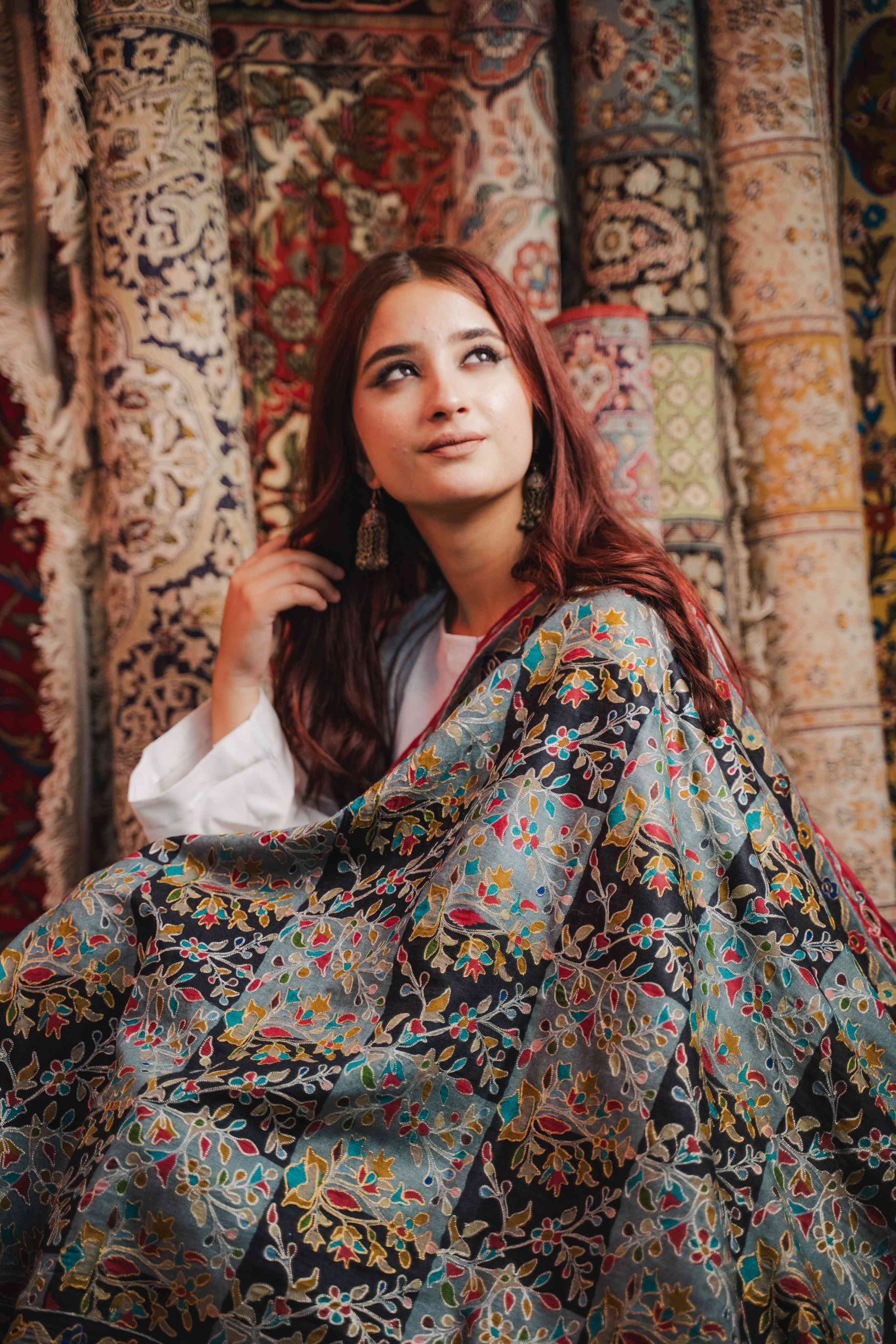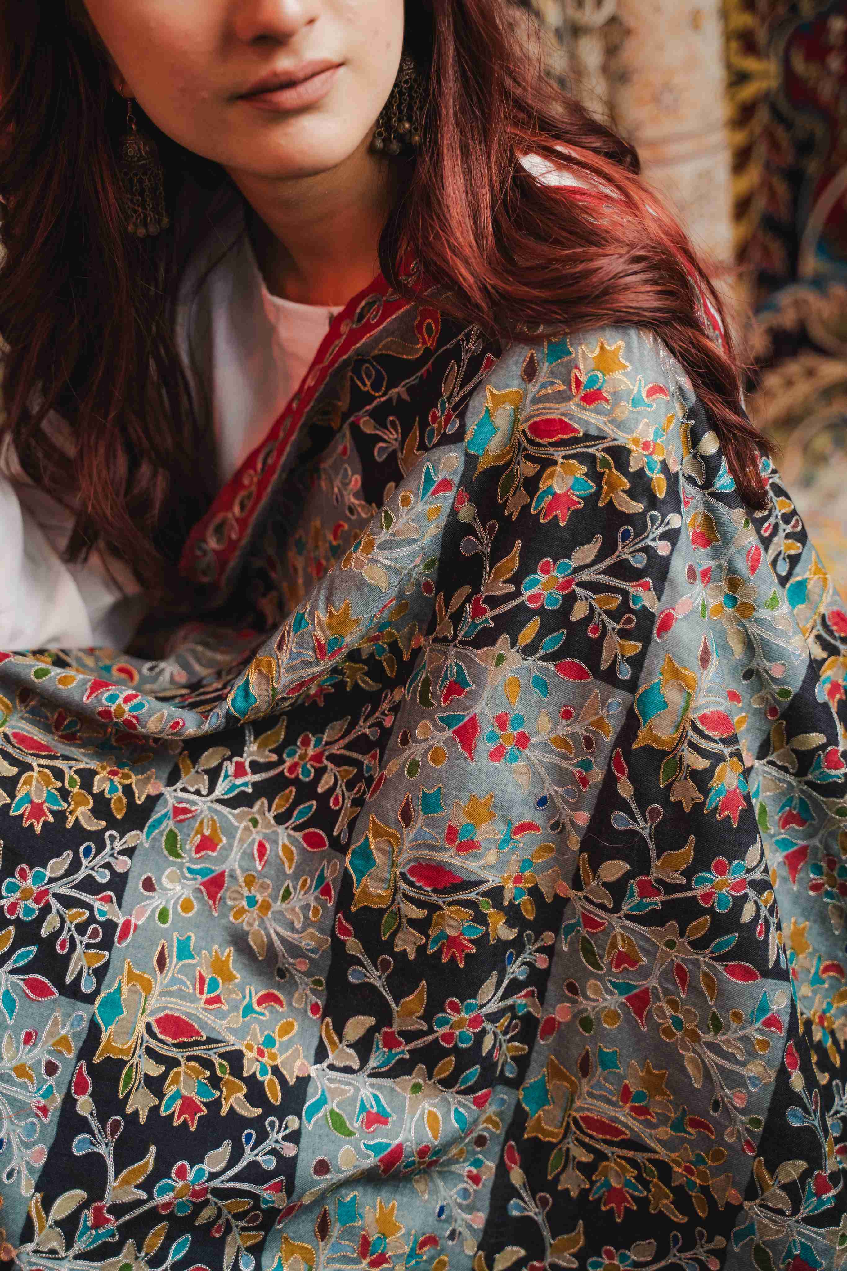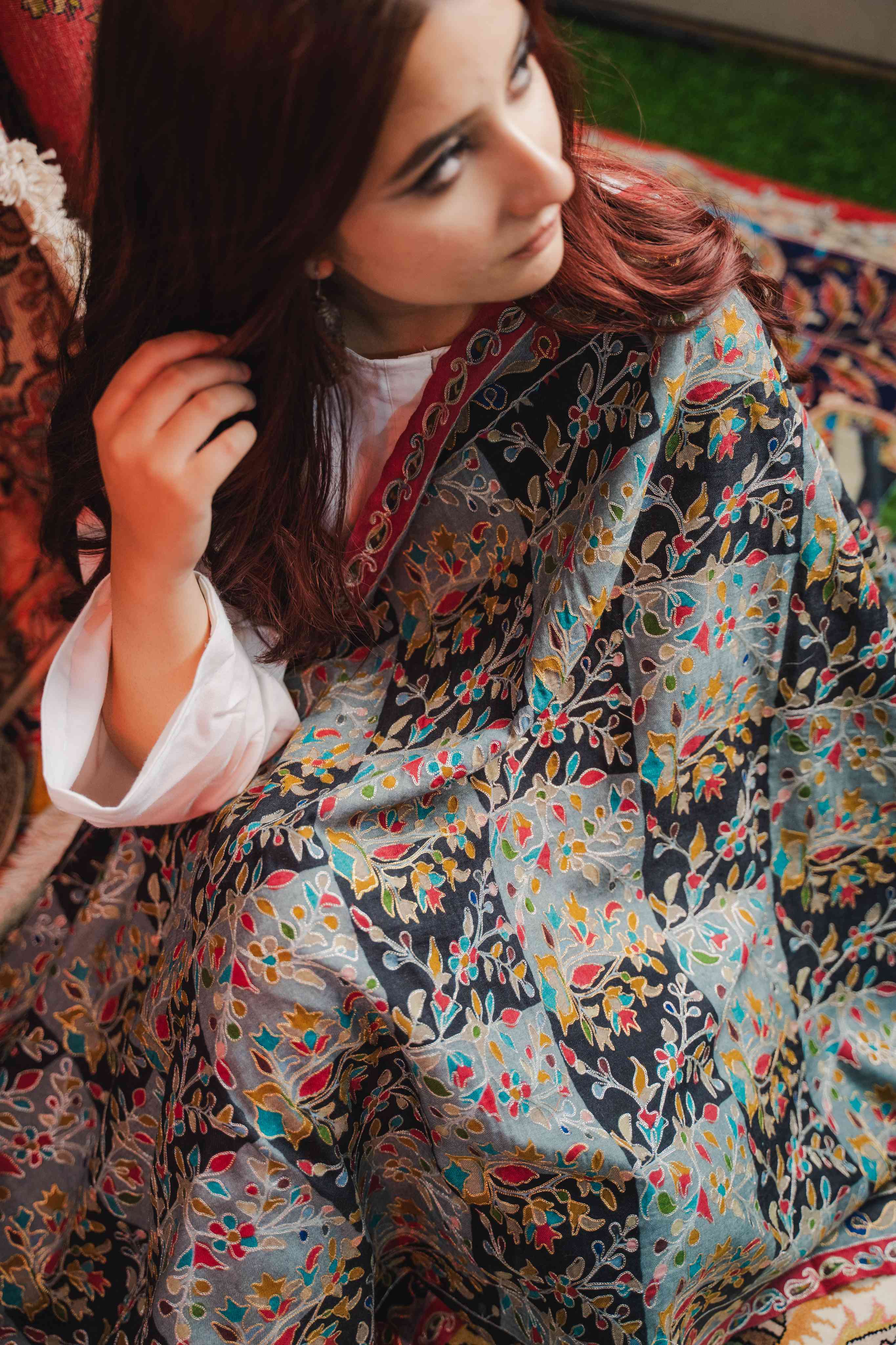 Kashmiri Kalamkari Shawl - Black Hamdan | Zari Outline