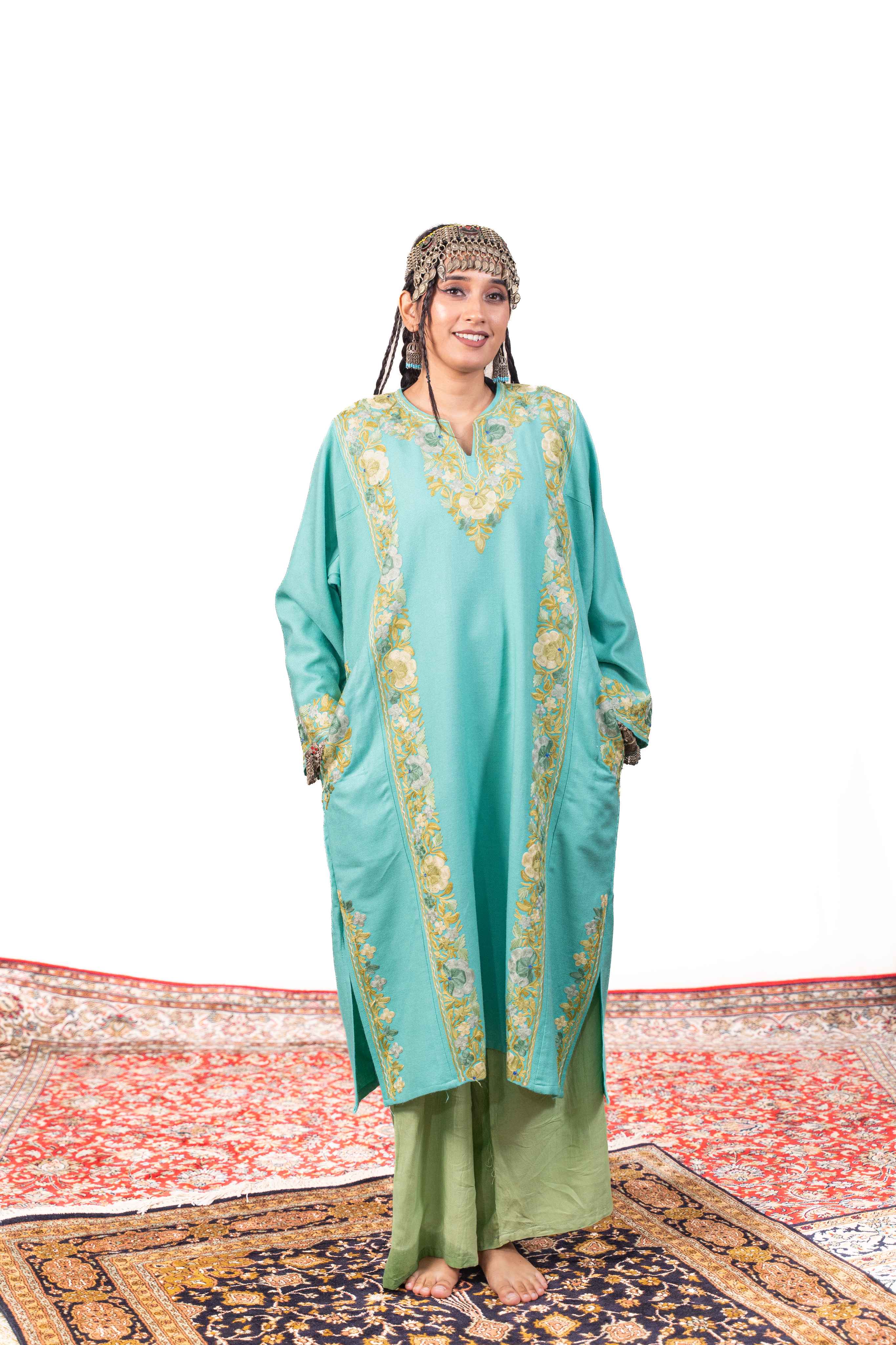Embrace timeless Kashmiri elegance with this stunning turquoise pheran, adorned with intricate aari embroidery across the sleeves, neckline, border, and back. Crafted for comfort, this piece balances warmth with a surprisingly light feel, making it perfect for layering through seasons. Practical pockets add everyday functionality to its traditional charm. A versatile wardrobe essential that celebrates authentic craftsmanship and effortless style.
